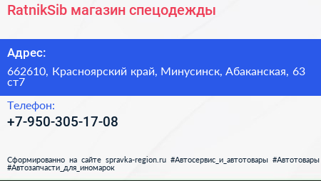 RatnikSib, магазин спецодежды по адресу 662610, Красноярский край, Минусинск, Абаканская, 63 ст7 в дальнейшем Организация, размещена в следующих категориях: