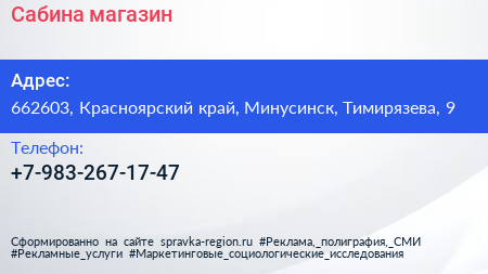 Сабина, магазин по адресу 662603, Красноярский край, Минусинск, Тимирязева, 9 в дальнейшем Организация, размещена в следующих категориях: