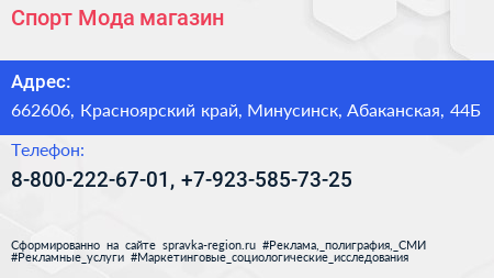 Спорт+Мода, магазин по адресу 662606, Красноярский край, Минусинск, Абаканская, 44Б в дальнейшем Организация, размещена в следующих категориях:
