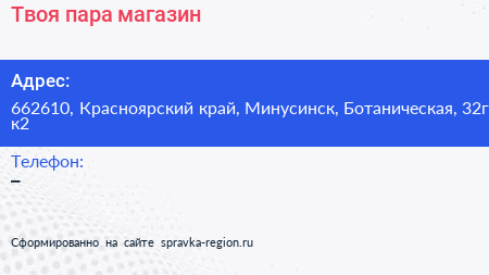 Твоя пара, магазин по адресу 662610, Красноярский край, Минусинск, Ботаническая, 32г к2 в дальнейшем Организация, размещена в следующих категориях: