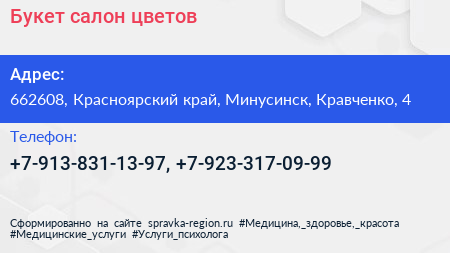 Букет, салон цветов по адресу 662608, Красноярский край, Минусинск, Кравченко, 4 в дальнейшем Организация, размещена в следующих категориях: