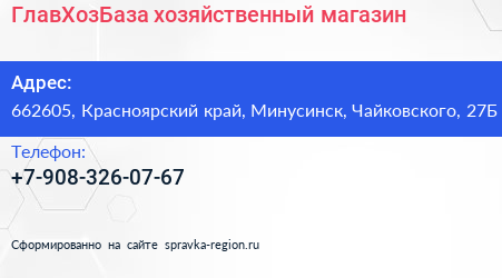 ГлавХозБаза, хозяйственный магазин по адресу 662605, Красноярский край, Минусинск, Чайковского, 27Б в дальнейшем Организация, размещена в следующих категориях: