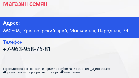 Магазин семян по адресу 662606, Красноярский край, Минусинск, Народная, 74 в дальнейшем Организация, размещена в следующих категориях: