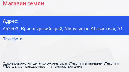 Магазин семян по адресу 662603, Красноярский край, Минусинск, Абаканская, 51 в дальнейшем Организация, размещена в следующих категориях: