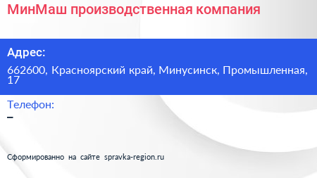 МинМаш, производственная компания по адресу 662600, Красноярский край, Минусинск, Промышленная, 17 в дальнейшем Организация, размещена в следующих категориях: