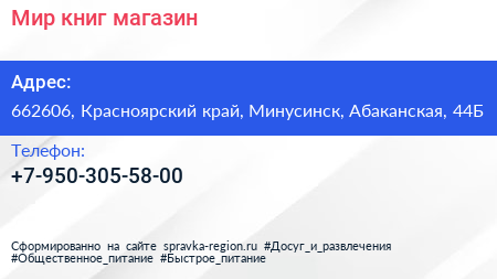Мир книг, магазин по адресу 662606, Красноярский край, Минусинск, Абаканская, 44Б в дальнейшем Организация, размещена в следующих категориях: