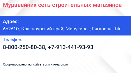Муравейник, сеть строительных магазинов по адресу 662610, Красноярский край, Минусинск, Гагарина, 14г в дальнейшем Организация, размещена в следующих категориях: