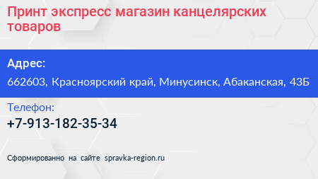 Принт экспресс, магазин канцелярских товаров по адресу 662603, Красноярский край, Минусинск, Абаканская, 43Б в дальнейшем Организация, размещена в следующих категориях: