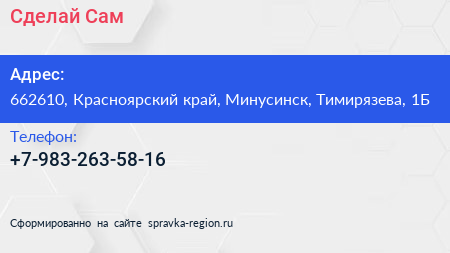 Сделай Сам по адресу 662610, Красноярский край, Минусинск, Тимирязева, 1Б в дальнейшем Организация, размещена в следующих категориях: