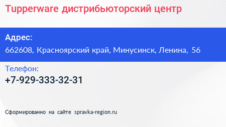 Tupperware, дистрибьюторский центр по адресу 662608, Красноярский край, Минусинск, Ленина, 56 в дальнейшем Организация, размещена в следующих категориях: