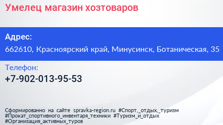 Умелец, магазин хозтоваров по адресу 662610, Красноярский край, Минусинск, Ботаническая, 35 в дальнейшем Организация, размещена в следующих категориях: