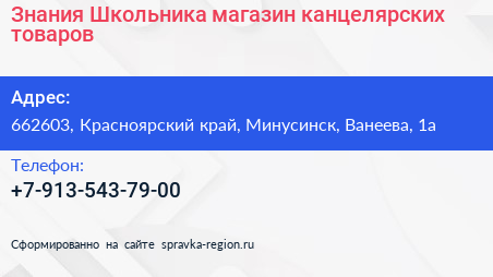 Знания Школьника, магазин канцелярских товаров по адресу 662603, Красноярский край, Минусинск, Ванеева, 1а в дальнейшем Организация, размещена в следующих категориях: