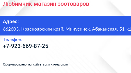Любимчик, магазин зоотоваров по адресу 662603, Красноярский край, Минусинск, Абаканская, 51 к1 в дальнейшем Организация, размещена в следующих категориях: