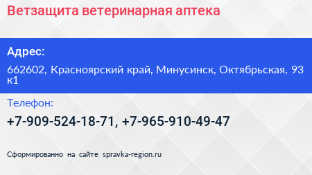Ветзащита, ветеринарная аптека по адресу 662602, Красноярский край, Минусинск, Октябрьская, 93 к1 в дальнейшем Организация, размещена в следующих категориях: