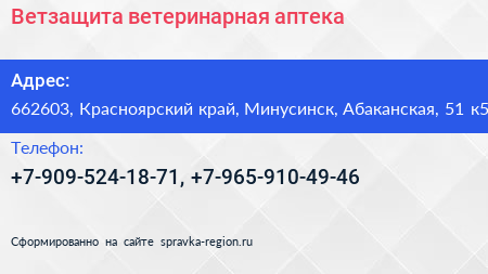 Ветзащита, ветеринарная аптека по адресу 662603, Красноярский край, Минусинск, Абаканская, 51 к5 в дальнейшем Организация, размещена в следующих категориях: