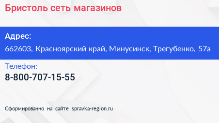 Бристоль, сеть магазинов по адресу 662603, Красноярский край, Минусинск, Трегубенко, 57а в дальнейшем Организация, размещена в следующих категориях: