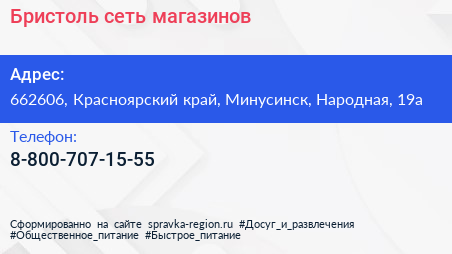 Бристоль, сеть магазинов по адресу 662606, Красноярский край, Минусинск, Народная, 19а в дальнейшем Организация, размещена в следующих категориях:
