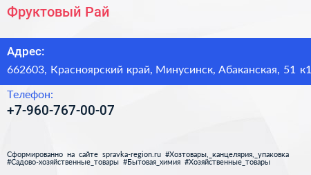 Фруктовый Рай по адресу 662603, Красноярский край, Минусинск, Абаканская, 51 к1 в дальнейшем Организация, размещена в следующих категориях: