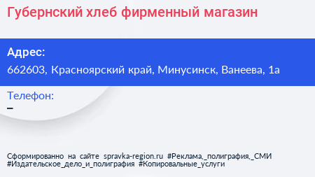 Губернский хлеб, фирменный магазин по адресу 662603, Красноярский край, Минусинск, Ванеева, 1а в дальнейшем Организация, размещена в следующих категориях: