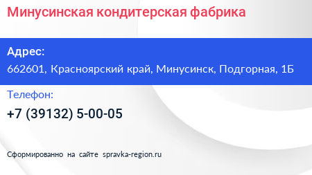 Минусинская кондитерская фабрика по адресу 662601, Красноярский край, Минусинск, Подгорная, 1Б в дальнейшем Организация, размещена в следующих категориях: