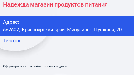 Надежда, магазин продуктов питания по адресу 662602, Красноярский край, Минусинск, Пушкина, 70 в дальнейшем Организация, размещена в следующих категориях: