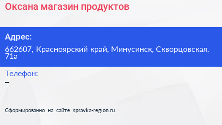 Оксана, магазин продуктов по адресу 662607, Красноярский край, Минусинск, Скворцовская, 71а в дальнейшем Организация, размещена в следующих категориях: