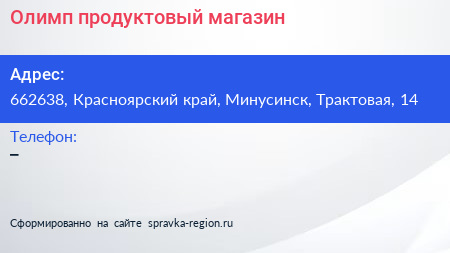 Олимп, продуктовый магазин по адресу 662638, Красноярский край, Минусинск, Трактовая, 14 в дальнейшем Организация, размещена в следующих категориях: