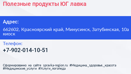 Полезные продукты-ЮГ, лавка по адресу 662602, Красноярский край, Минусинск, Затубинская, 10а киоск в дальнейшем Организация, размещена в следующих категориях: