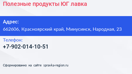 Полезные продукты-ЮГ, лавка по адресу 662606, Красноярский край, Минусинск, Народная, 23 в дальнейшем Организация, размещена в следующих категориях: