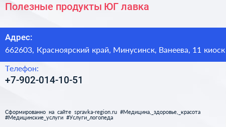 Полезные продукты-ЮГ, лавка по адресу 662603, Красноярский край, Минусинск, Ванеева, 11 киоск в дальнейшем Организация, размещена в следующих категориях: