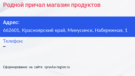 Родной причал, магазин продуктов по адресу 662601, Красноярский край, Минусинск, Набережная, 1 в дальнейшем Организация, размещена в следующих категориях: