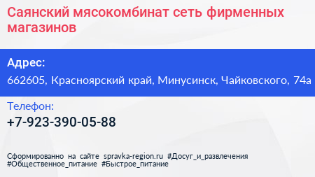 Саянский мясокомбинат, сеть фирменных магазинов по адресу 662605, Красноярский край, Минусинск, Чайковского, 74а в дальнейшем Организация, размещена в следующих категориях: