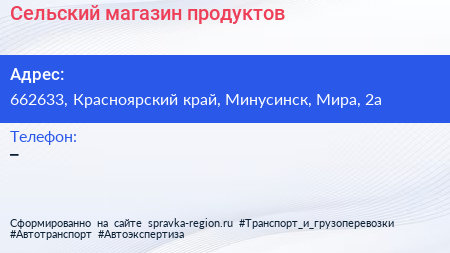 Сельский, магазин продуктов по адресу 662633, Красноярский край, Минусинск, Мира, 2а в дальнейшем Организация, размещена в следующих категориях: