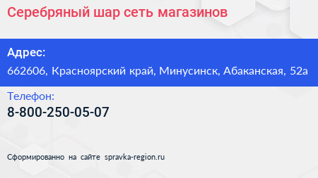 Серебряный шар, сеть магазинов по адресу 662606, Красноярский край, Минусинск, Абаканская, 52а в дальнейшем Организация, размещена в следующих категориях: