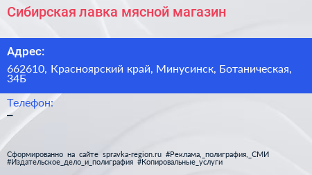Сибирская лавка, мясной магазин по адресу 662610, Красноярский край, Минусинск, Ботаническая, 34Б в дальнейшем Организация, размещена в следующих категориях: