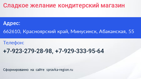 Сладкое желание, кондитерский магазин по адресу 662610, Красноярский край, Минусинск, Абаканская, 55 в дальнейшем Организация, размещена в следующих категориях: