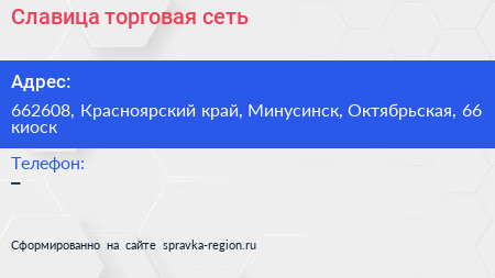 Славица, торговая сеть по адресу 662608, Красноярский край, Минусинск, Октябрьская, 66 киоск в дальнейшем Организация, размещена в следующих категориях: