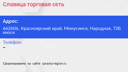 Славица, торговая сеть по адресу 662606, Красноярский край, Минусинск, Народная, 72Б киоск в дальнейшем Организация, размещена в следующих категориях: