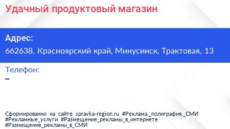 Удачный, продуктовый магазин по адресу 662638, Красноярский край, Минусинск, Трактовая, 13 в дальнейшем Организация, размещена в следующих категориях:
