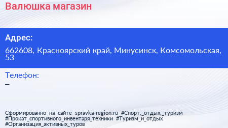 Валюшка, магазин по адресу 662608, Красноярский край, Минусинск, Комсомольская, 53 в дальнейшем Организация, размещена в следующих категориях: