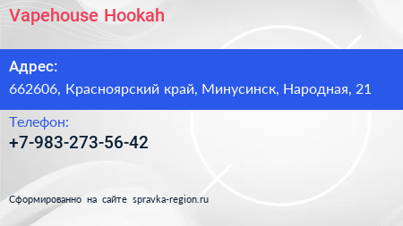 Vapehouse & Hookah по адресу 662606, Красноярский край, Минусинск, Народная, 21 в дальнейшем Организация, размещена в следующих категориях: