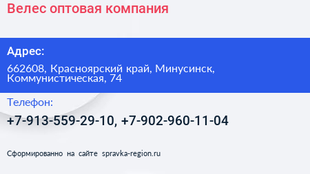 Велес, оптовая компания по адресу 662608, Красноярский край, Минусинск, Коммунистическая, 74 в дальнейшем Организация, размещена в следующих категориях: