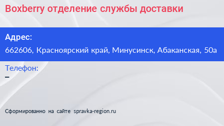 Boxberry, отделение службы доставки по адресу 662606, Красноярский край, Минусинск, Абаканская, 50а в дальнейшем Организация, размещена в следующих категориях: