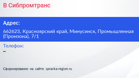 В-Сибпромтранс по адресу 662623, Красноярский край, Минусинск, Промышленная (Промзона), 7/1 в дальнейшем Организация, размещена в следующих категориях: