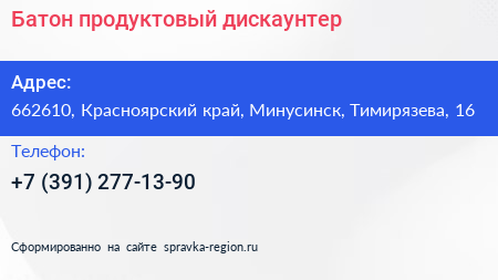 Батон, продуктовый дискаунтер по адресу 662610, Красноярский край, Минусинск, Тимирязева, 16 в дальнейшем Организация, размещена в следующих категориях: