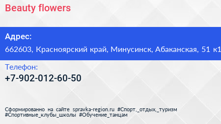 Beauty flowers по адресу 662603, Красноярский край, Минусинск, Абаканская, 51 к1 в дальнейшем Организация, размещена в следующих категориях: