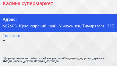Калина, супермаркет по адресу 662603, Красноярский край, Минусинск, Тимирязева, 33Б в дальнейшем Организация, размещена в следующих категориях: