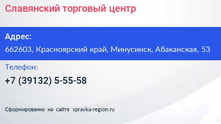 Славянский, торговый центр по адресу 662603, Красноярский край, Минусинск, Абаканская, 53 в дальнейшем Организация, размещена в следующих категориях: