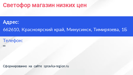 Светофор, магазин низких цен по адресу 662610, Красноярский край, Минусинск, Тимирязева, 1Б в дальнейшем Организация, размещена в следующих категориях: