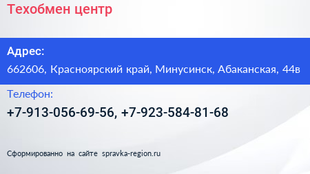 Техобмен, центр по адресу 662606, Красноярский край, Минусинск, Абаканская, 44в в дальнейшем Организация, размещена в следующих категориях: